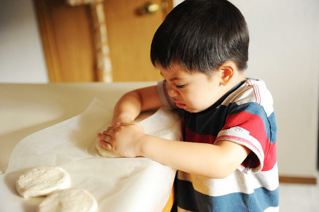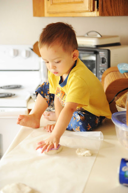 I promise he was having fun, but he looks super angry pressing the cookie cutter into the dough here 🙂