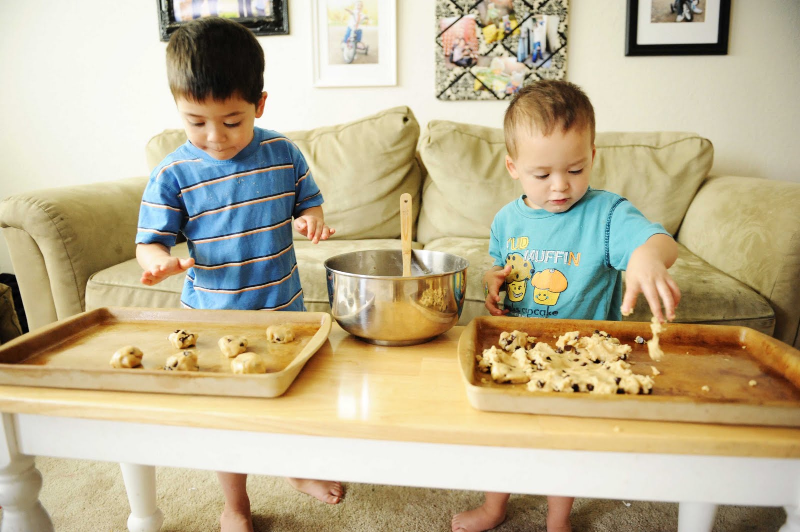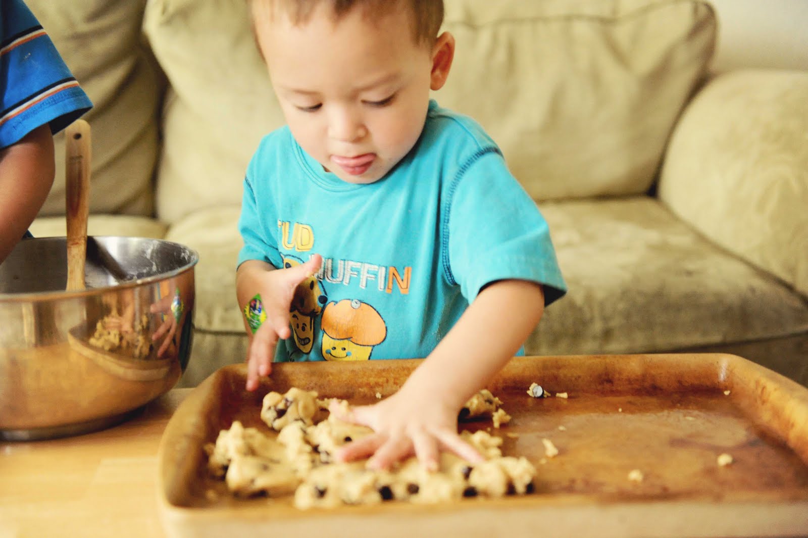 Then it was cookie sheet time. All Ethan heard was “grab chunks of dough and smash it on the cookie sheet!”