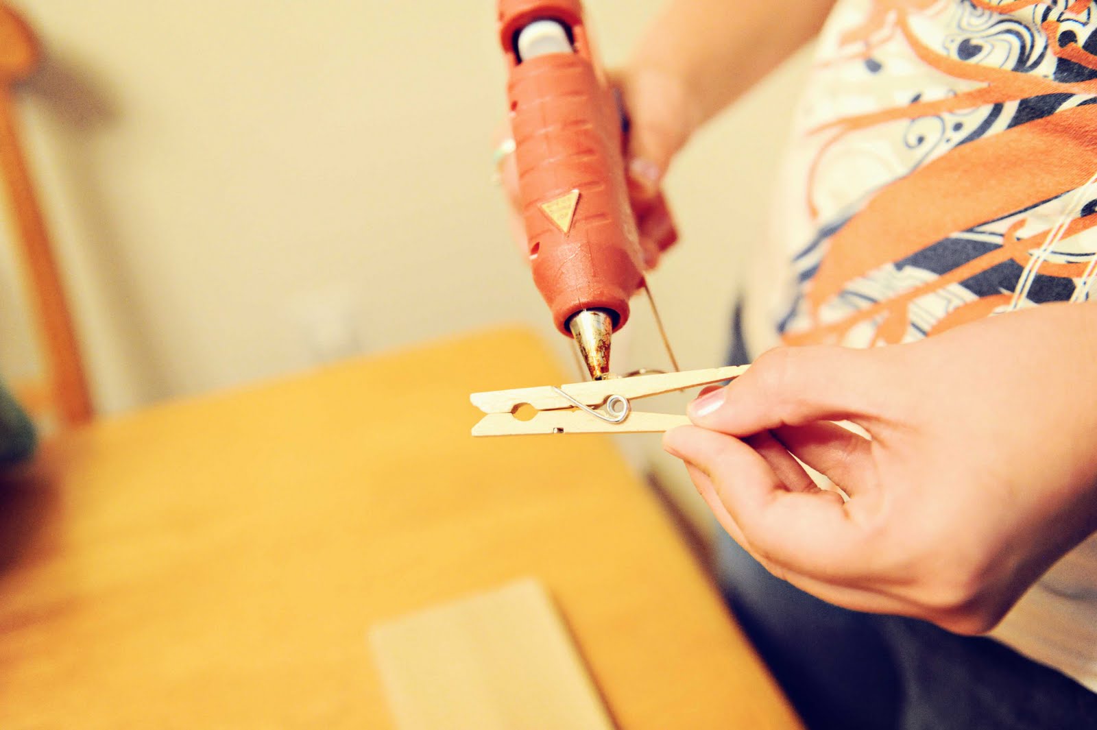 Step 2: Glue the craft stick to the clothespin. We put the glued end right about where the piece of metal is on the clothespin.