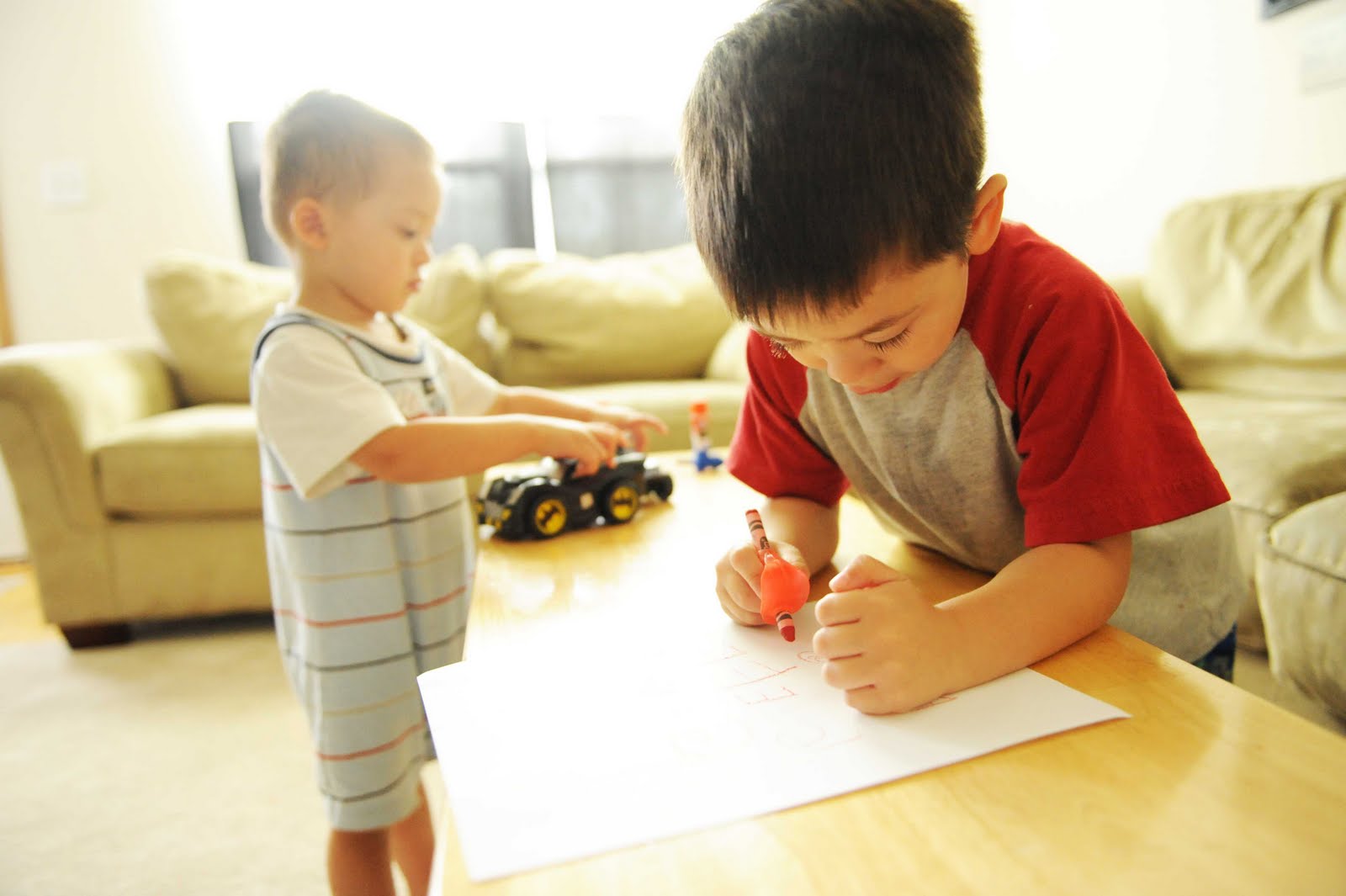 I love telling stories with pictures. This is really how our boys are right now, handwriting practice with little brother playing with the Batmobile!